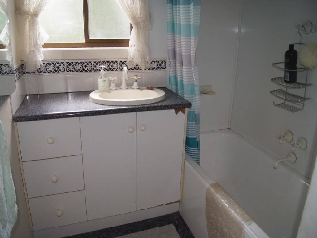 - Bathroom has vinyl floor coverings, lace curtains, shower/bath, toilet, heater light, cabinet/mirror and exhaust fan.